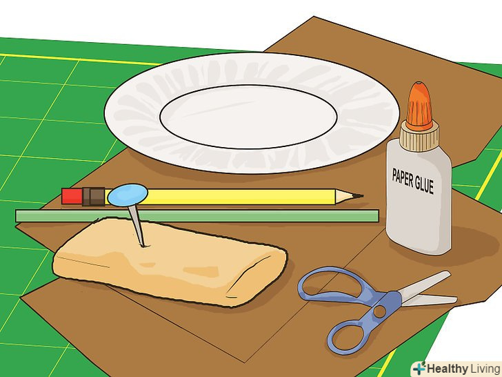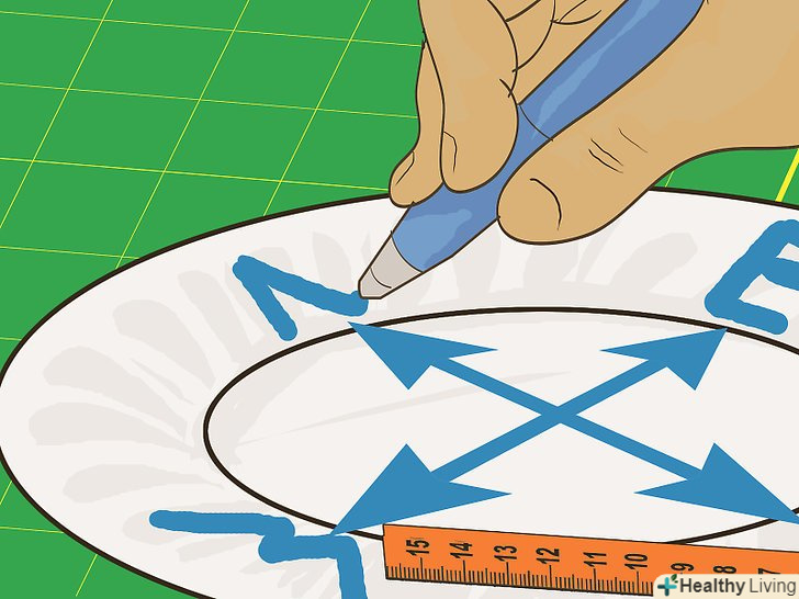 Позначте на паперовій тарілці чотири напрямки.Візьміть паперову тарілку і напишіть на чотирьох її сторонах "північ», «південь», «схід»і "захід".[20]- Закріпіть в центрі паперової тарілки пластилінове підставу з вставленою в нього стрілкою.