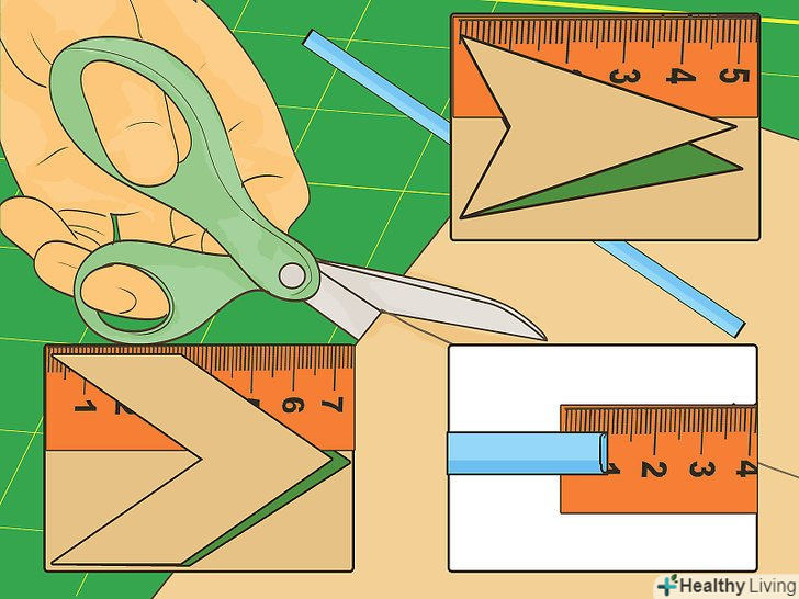 Зробіть стрілку.виріжте з картонної папки стрілку довжиною п'ять сантиметрів і такою ж шириною в основі. Після цього виріжте хвіст стрілки довжиною сім сантиметрів і з такою ж шириною.[18]- Візьміть соломинку і зробіть надрізи довжиною один сантиметр з обох її кінців. Зберіть стрілку: протягніть її наконечник в один надріз, а в другому закріпіть хвіст.