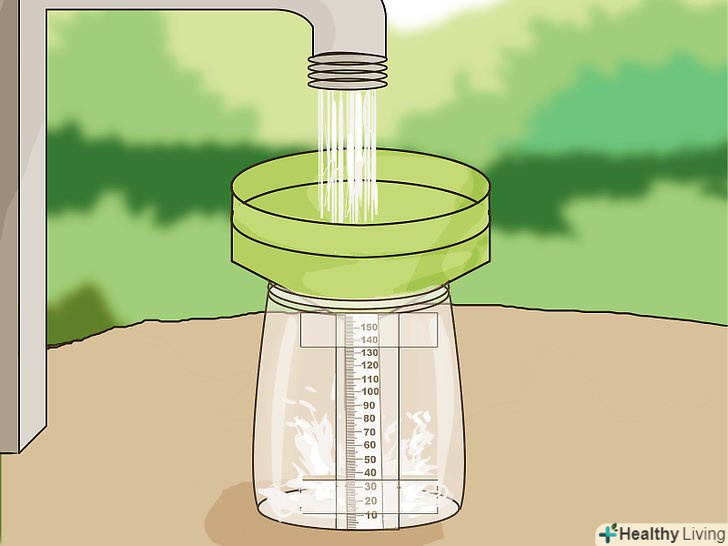 Випробуйте дощемір.якщо у вашій місцевості рідко йдуть дощі в поточний час року, можна перевірити дощемір за допомогою водопровідної води. Просто налийте в дощемір воду і виміряйте її рівень.[25]- У дощовий день можна виставити дощемір під відкрите небо. Простежте, щоб дощемір не закривали дерева та інші перешкоди, які можуть заблокувати дощ. Після дощу перевірте рівень води в банку. Не забудьте виливати воду з банки після кожного вимірювання, щоб отримати точні результати.