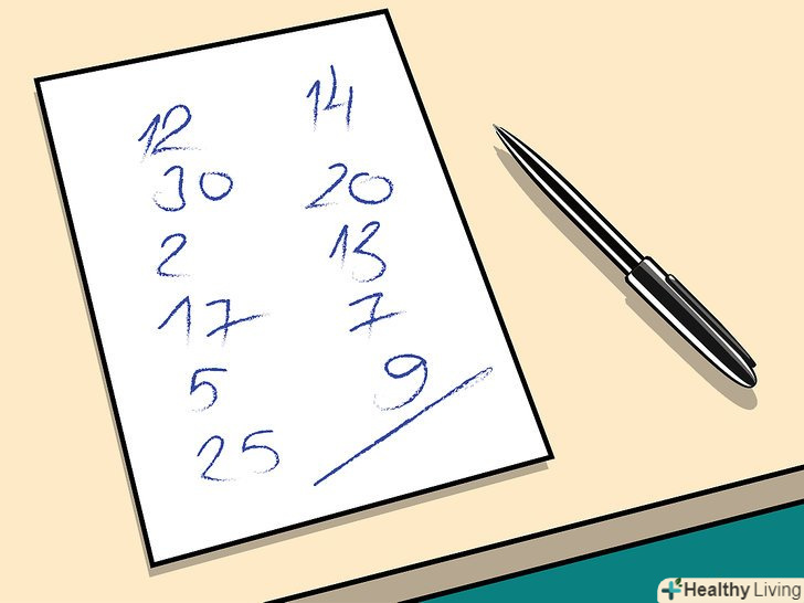 Запишіть всі числа, на яких зупинявся циферблат замка.повторіть цю дію більше 11 разів. 7 з отриманих чисел виявляться між двома цифрами-пропустіть їх. Продовжуйте працювати з 5 випали числами. З цих 5 чисел одне число не повинно закінчуватися на одну і ту ж цифру. Це ваше третє число.- Дуже важливо знати, де конкретно зупиняється циферблат замку, тому намагайтеся і уважно дивіться на замок.