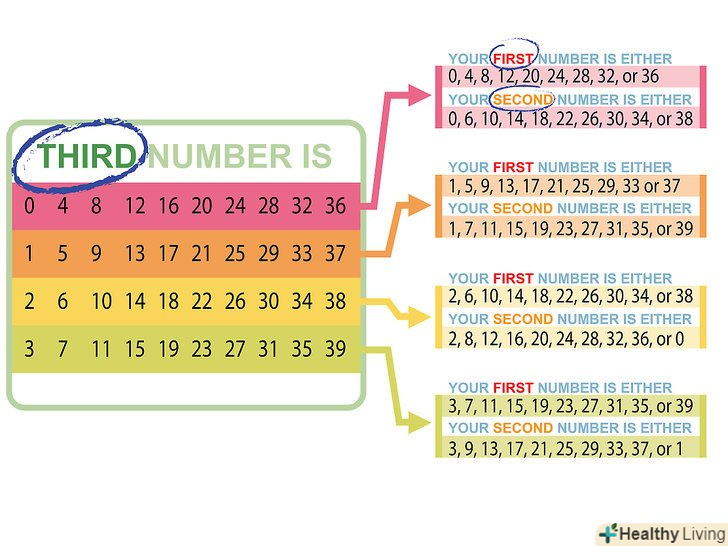 Скористайтеся методом проб і помилок.тепер у вас 100 можливих комбінацій, і це робота на 15 хвилин. Знаючи третє число, ви зможете дізнатися перше і друге, хочете - вірте, хочете - ні. Це займе трохи часу, але в підсумку ви відкриєте замок.- Якщо ваше третє число 0, 4, 8, 12, 16, 20, 24, 28, 32 або 36:
