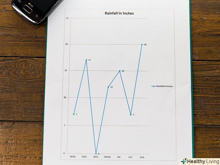 Позначте кількість опадів на графіку або в таблиці.наприклад, ви можете намалювати таблицю 7 x 7, горизонтальні осередки означатимуть дні тижня, а вертикальні сантиметри (від 2.5 до 20). Після того, як ви поставите крапку позначає кількість дощу в кожен з днів, ви можете з'єднати ці точки за допомогою лінійки і побачити коливання рівня опадів за тиждень.