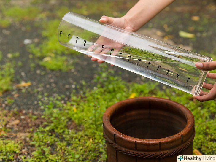 Поставте плювіометр прямо.Плювіометр повинен стояти прямо для точного вимірювання рівня дощу. Щоб уникнути його перекидання, помістіть плювіометр в більш міцний контейнер, наприклад, у важке відро або горщик з-під квітів.- Якщо у вас немає захищеного від вітру контейнера, ви також можете помістити кілька камінчиків або інших схожих предметів на дно пластикової ємності, щоб надати їй стійкості. Тоді вам потрібно буде залити 2.5-3см від дна ємності водою і прийняти це за точку відліку для точного вимірювання рівня дощу.