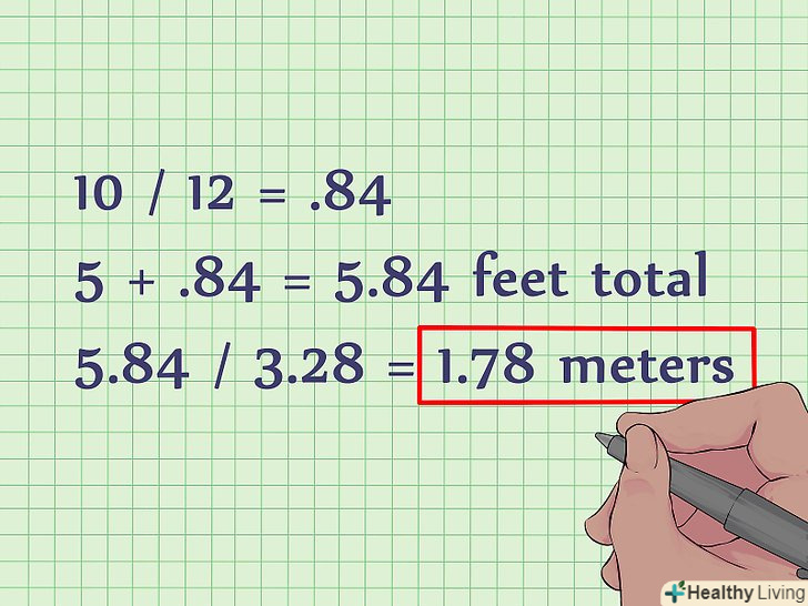 Не забудьте врахувати дюйми.у більшості випадків довжина представляється не як ціле число футів (1 фут, 2 фути, 3 фути і так далі), а як комбінація футів і дюймів (20 футів і 11 дюймів і так далі). У цьому випадку число дюймів потрібно розділити на 12, щоб знайти еквівалентну кількість футів (якщо число дюймів менше 12, результат буде менше 1). Потім отримане значення додайте до числа футів, а суму конвертуйте в метри.- Наприклад, перетворюємо 5 футів 10 дюймів в метри. Для цього: