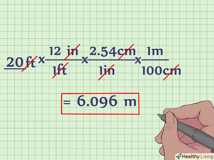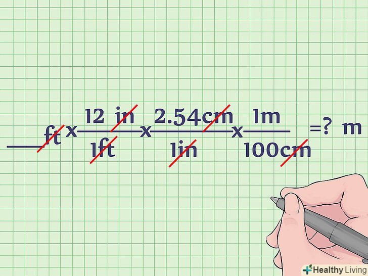 Переконайтеся, що однакові одиниці виміру скорочуються. якщо рівняння записано так, як представлено вище, всі одиниці виміру (крім метрів) скоротяться. Зверніть увагу, що якщо одиниця виміру з'являється як в чисельнику, так і в знаменнику дробу, цю одиницю виміру можна скоротити.- Думайте про дробову рису як про Привід «на». Наприклад «" 12 дюймів на 1 фут», «2,54 см на 1 дюйм» і «1 м на 100 см». Якщо думати таким чином про рівняння перетворення, легко зрозуміти, як і чому скорочуються одиниці виміру-просто вихідне значення в футах проходить через ряд операцій, які перетворюють його в дюймах, потім в сантиметри, а потім в метри.
