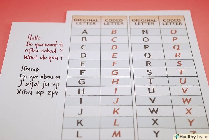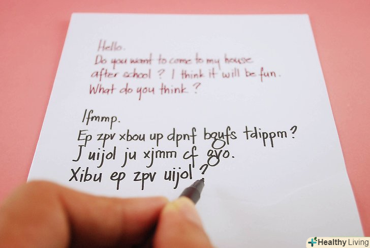 Поміняйте кожну букву на наступну букву в алфавіті.наприклад,» Привіт «буде»рсйгеу". Такий тип коду називається "ПРО1«, що має на увазі»прокрутка на одну букву вперед".- Його важко вивчити, проте пишіть код на листку паперу таким чином: