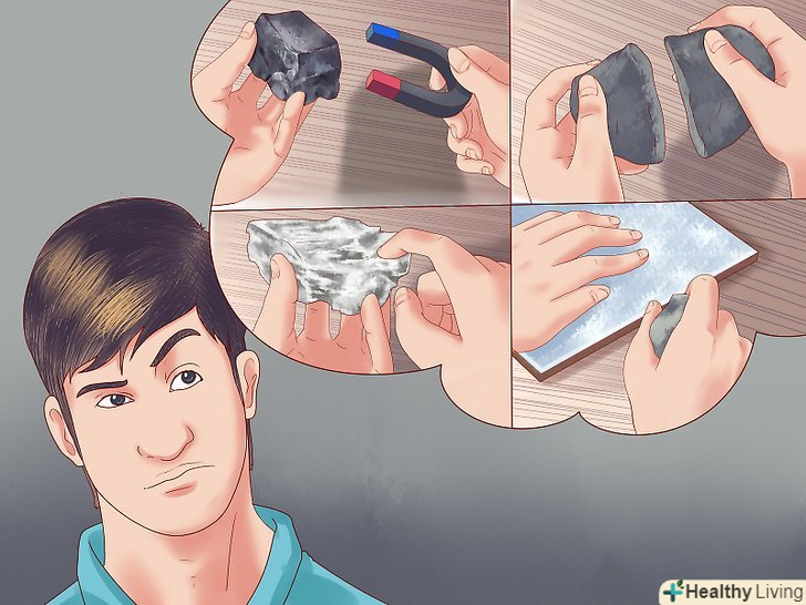 Якщо ви все ще не ідентифікували ваш мінерал, можна провести додаткові досліди.у розпорядженні геологів є багато інших тестів для класифікації мінералів. Однак, багато хто просто марні для визначення найбільш поширених видів, багато зажадають спеціального обладнання або небезпечних матеріалів. Ось короткий опис декількох дослідів, які можуть виявитися необхідними:- Якщо ваш мінерал притягується магнітом, то, швидше за все, це магнетит або магнітний залізняк, - єдиний феромагнетик з ряду поширених мінералів. Якщо тяжіння слабке або не задовольняє визначенню магнетиту, то ваш екземпляр може бути пірротином (або магнітним колчеданом), франклінітом і ільменітом (або титановим Залізняком).[5]
