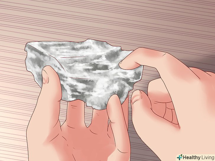Оцініть твердість матеріалу.для швидкого визначення твердості матеріалу геологи користуються шкалою твердості Мооса, названої так на честь її творця. Якщо результат підходить під коефіцієнт твердості "4", але не дотягує до "5", значить, коефіцієнт вашого мінералу знаходиться між "4" і "5", - можете припинити досвід. Спробуйте процарапать ваш мінерал, скориставшись звичайними предметами, які згадані нижче (або мінералами з набору для визначення твердості); почніть з нижніх показників і, якщо тест дав позитивний результат, рухайтеся вгору за шкалою до верхніх показників:[3]- 1 -- Легко процарапать нігтем, на дотик масляний і м'який (відповідає насічка стеаритом)