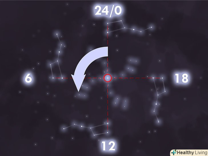 Використовуйте ківш Великої Ведмедиці для визначення часу доби.Велика ведмедиця являє собою околополярное сузір'я. Воно не сходить і не заходить, на відміну від сонця. Ківш Великої Ведмедиці обертається навколо Північного полюса світу.- Протягом ночі Велика Ведмедиця обертається навколо Полярної зірки проти годинникової стрілки верхнім краєм ковша вперед. Повний оборот вона здійснює за один зоряний день, який на 4 хвилини коротше звичайних 24-годинних діб.