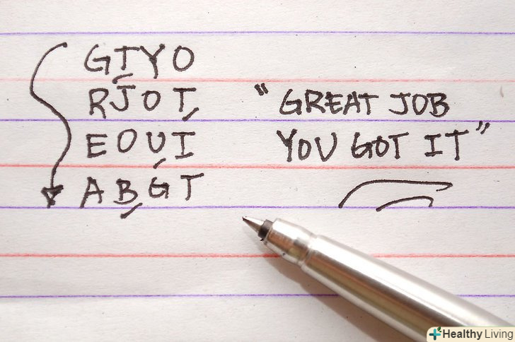 Почніть читати з верхньої лівої літери, рухайтеся вниз, потім візьміть наступну букву зліва у верхньому ряду, прочитайте всі букви під нею.у нашому прикладі вийде таке повідомлення:"GREAT JOB YOU GOT IT".