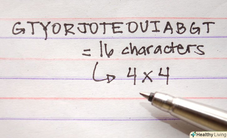 Визначте, на яку кількість рядів ви можете розділити букви порівну (знайдіть квадратний корінь кількості символів).у нашому випадку це 4, тому що квадратний корінь з 16 = 4. Якщо у нас є 25 символів, ми розташуємо їх в 5 рядів по 5 символів і так далі. Якщо неможливо знайти квадратний корінь з кількості символів без залишку, округлите отриманий результат. Коріння беруться з таких чисел: 9,16,25,36,49 і так далі. Якщо у вашому коді 22 Символи, округліть це число до 25, а потім розташуйте символи в 5 рядів по 5 символів.