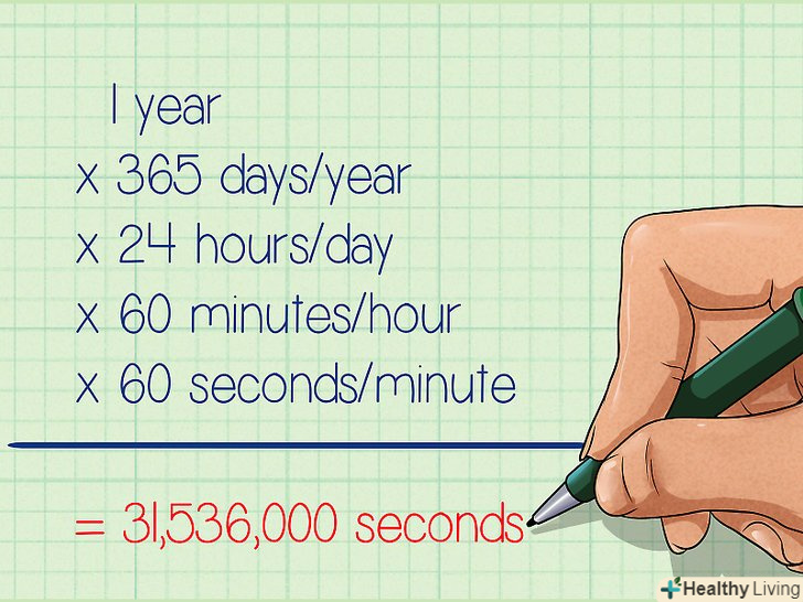Обчисліть кількість секунд на рік.для цього потрібно перемножити кількість днів у році, кількість годин в одному дні, кількість хвилин в одній годині і кількість секунд в одній хвилині.- 1 рік x 365 днів/рік x 24 години/день x 60 хвилин/годину x 60 секунд/хвилина = 31536000 секунд.[6]