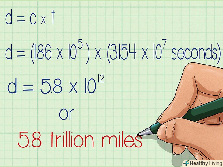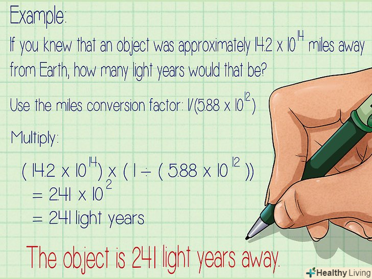 Вихідну відстань розділіть на коефіцієнт перетворення.тепер, коли ви знаєте коефіцієнти перетворення, вихідна відстань розділіть на відповідний коефіцієнт, щоб представити відстань у світлових роках. Якщо ви працюєте з великими числами, записуйте їх в експоненціальному форматі.- Наприклад: космічний об'єкт знаходиться на відстані 14,2 x 1014 км від Землі. Уявіть цю відстань у світлових роках.