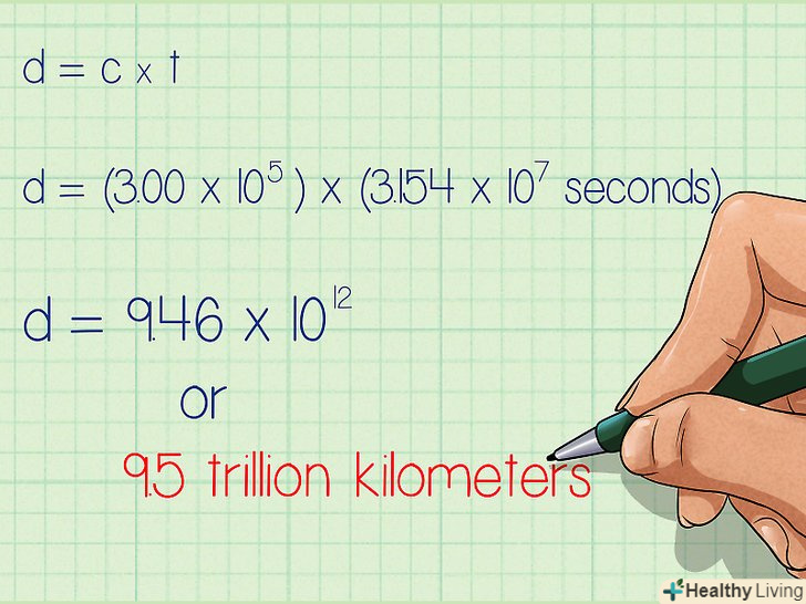 Підставте значення в формулу.тепер, коли Вам відомі значення швидкості світла і часу, підставте їх в формулу d = C x t і обчисліть світловий рік. Замість «с» підставте 3 x 105 км/с, а замість «t» підставте 3,15 x 107 с.[7]- D = c x t
