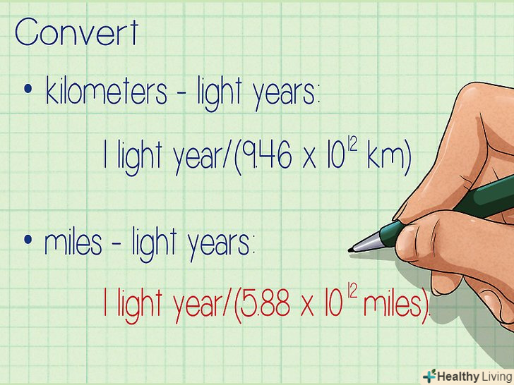 Запам'ятайте визначення світлового року. світлий рік-це одиниця виміру відстані, рівна дистанції, яку проходить промінь світла за один рік. Відстані у Всесвіті настільки великі, що астрономи користуються світловими роками. Якщо відстані у Всесвіті вимірювати в кілометрах, доведеться працювати з величезними і незручними числами.[2]- В астрономії використовується ще одна одиниця виміру відстані — парсек. Один парсек дорівнює 3,26 світлових років. Ця одиниця виміру також служить для спрощення обчислень і представлення відстаней в астрономії.[3]