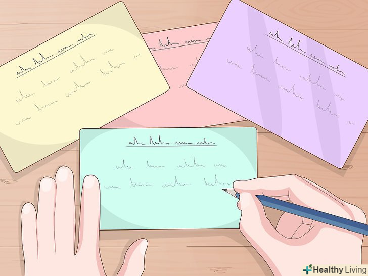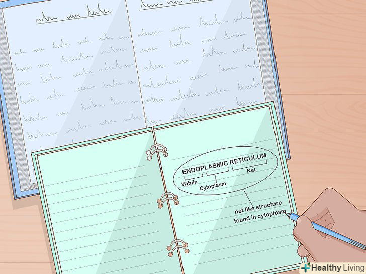 Щоб швидше вивчити термінологію, зробіть картки. картки — один з кращих способів запам'ятовувати і розуміти багато слів, з якими вам доведеться зіткнутися в біології. Можна носити картки з собою і вчити ці слова в будь-якому місці. Наприклад, можна робити це в машині по дорозі в школу. До того ж, сам процес створення карток – корисний спосіб вивчення нових слів. Спосіб вивчення нових слів за допомогою карток дуже ефективний.[3]- На початку кожної нової теми знайдіть слова, значення яких вам невідомо, і випишіть їх на картки.