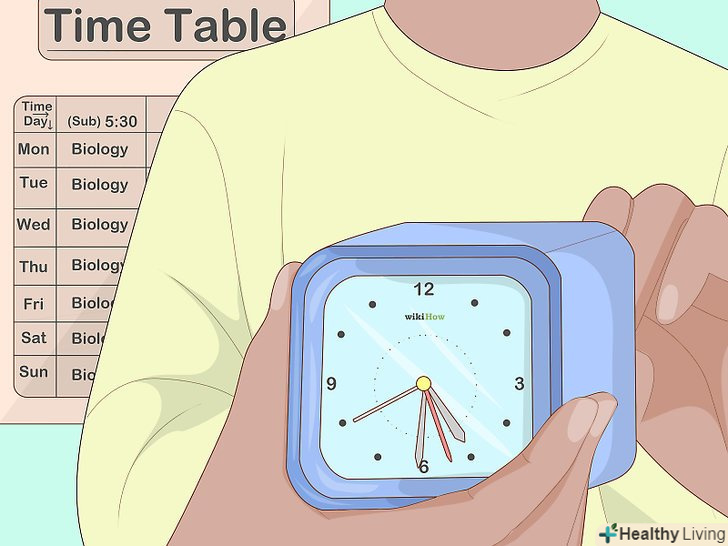 Виділіть час на вивчення біології.через те, що Біологія важка для розуміння, постарайтеся виділити час на її вивчення. Якщо ви будете вчити потроху кожен день, це увійде в звичку. Пізніше ви будете вдячні собі за свої старання, адже вам не доведеться вчити все відразу до іспиту, тому що ви будете поступово вчити все протягом семестру.[8]- Складіть розклад занять біологією і намагайтеся його дотримуватися. Якщо ви пропустили якесь заняття, не забудьте повернутися до цієї теми і почитати по ній матеріал, не відкладайте це на потім.