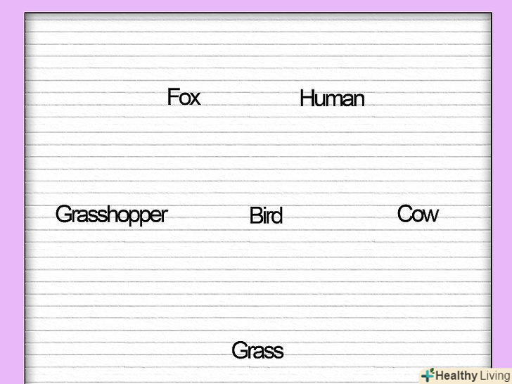 Візьміть аркуш паперу і в самому низу напишіть назву продуцента з цього списку (трава).потім, запишіть тварин і комах, які їдять продуцентів, а в самому кінці – м'ясоїдних.