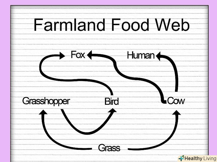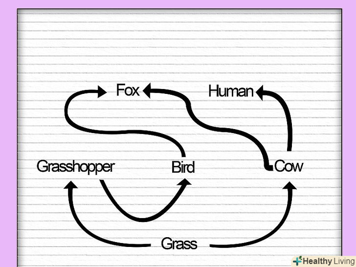 Намалюйте стрілочки, які зображують передачу енергії від організму до організму, тобто показують, хто що їсть.так, в цьому прикладі, намальовані 2 стрілочки від трави: до коника і до корови. Від коника стрілочка йде до птаха і так далі.- Можна придумати колірні позначення для стрілочок, якщо ви малюєте велику харчову мережу. Наприклад, для відносин рослини-тварини намалюйте зелені стрілочки, а для відносин тварини-тварини-червоні.