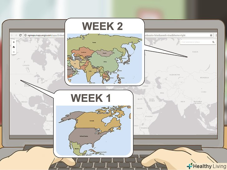 Перераховуйте країни в алфавітному порядку.щоб закріпити отримані знання про розташування країн на світовій карті, спробуйте перерахувати їх за алфавітом. Виберіть континент і перерахуйте в алфавітному порядку розташовані на ньому країни. Ускладнивши процес навчання, ви зможете сильніше сконцентруватися на матеріалі і вивчити його більш ретельно.[3]
