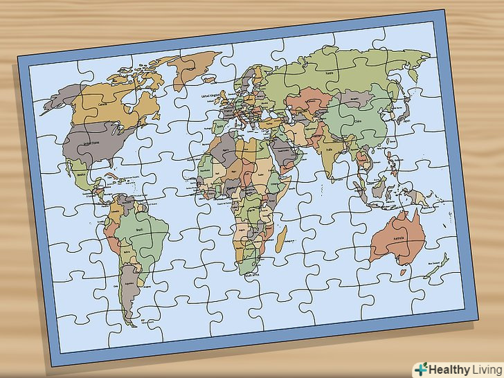 Зберіть пазл карти світу.робота над пазлом буде задіяти відразу кілька мозкових функцій, особливо, мислення, вміння вибудовувати послідовності і вирішувати головоломки. Працюючи над пазлом, постарайтеся залучити вже наявні у вас знання про країни. Тривала робота над пазлом карти світу в поєднанні з аналітичним мисленням допоможе вам краще запам'ятати розташування різних країн.[12]- Придбайте пазл із зображенням карти світу в магазині іграшок або в інтернет-магазині.