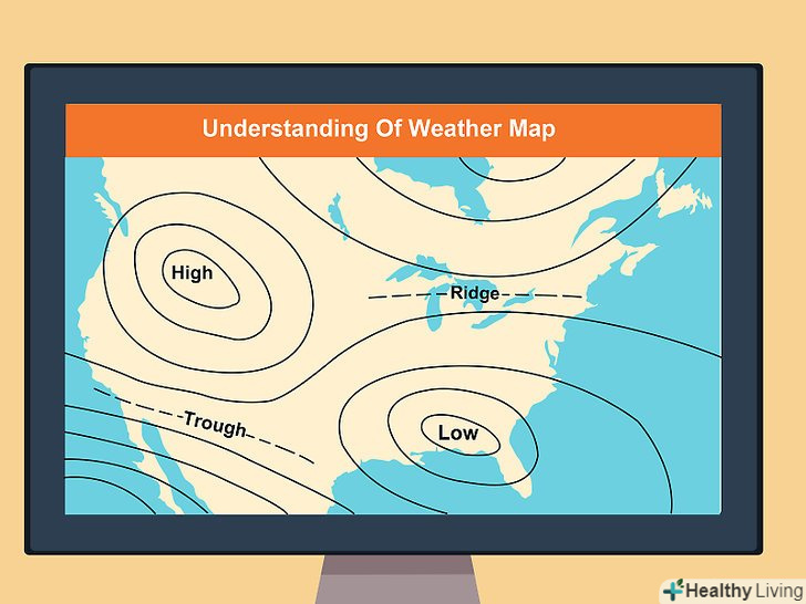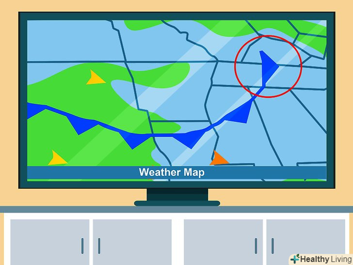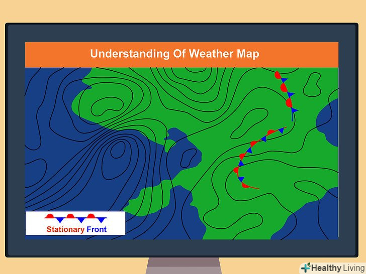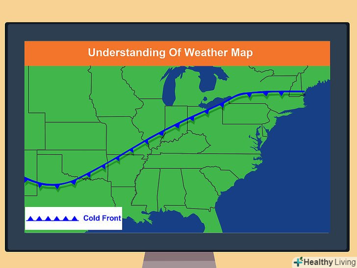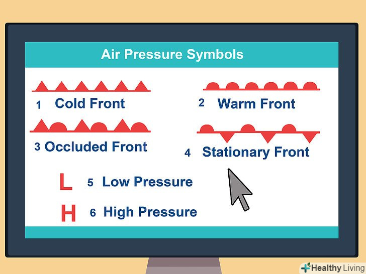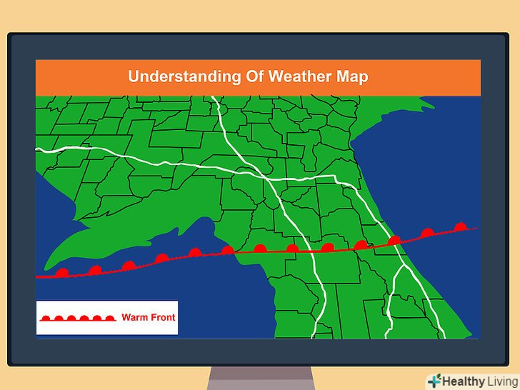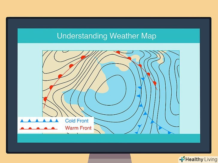 Спостерігайте за типами і рухом фронтів.вони позначають межу між теплим повітрям з одного боку і холодним — з іншого. Якщо ви знаходитесь поруч з фронтом і знаєте, що він рухається до вас, проходження кордону фронту через вашу місцевість призведе до зміни погодних умов (наприклад, підвищена хмарність, опади, грози і вітер). Гори і великі водойми можуть впливати на напрямок руху фронту.[8]- На синоптичній карті ви побачите лінії з напівкружями або трикутниками на одній або обох сторонах. Вони вказують на межі атмосферних фронтів.