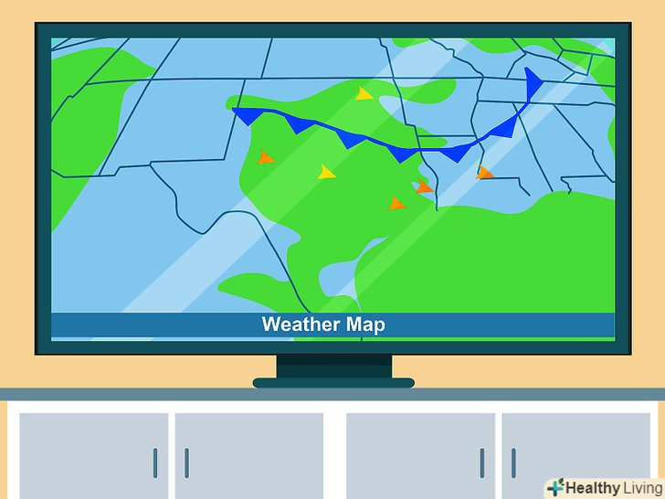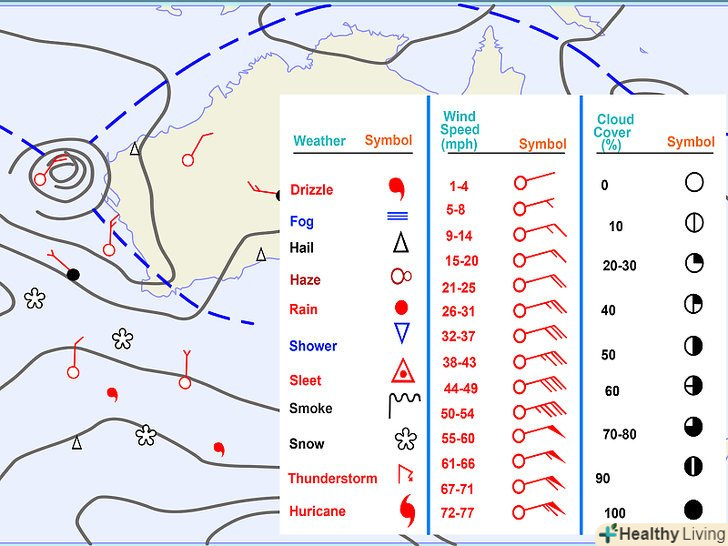 Вивчіть синоптичну карту.її можна побачити в телевізійних новинах, інтернеті або місцевій газеті. Іншими джерелами можуть бути журнали і книги, але це, зрозуміло, будуть не актуальні, а історичні карти або ж їх теоретичні приклади. Найпростіше завантажити карту з метеорологічного сайті і при необхідності вирізати з неї потрібні фрагменти. При бажанні її можна роздрукувати або вивчати на екрані.[3]
