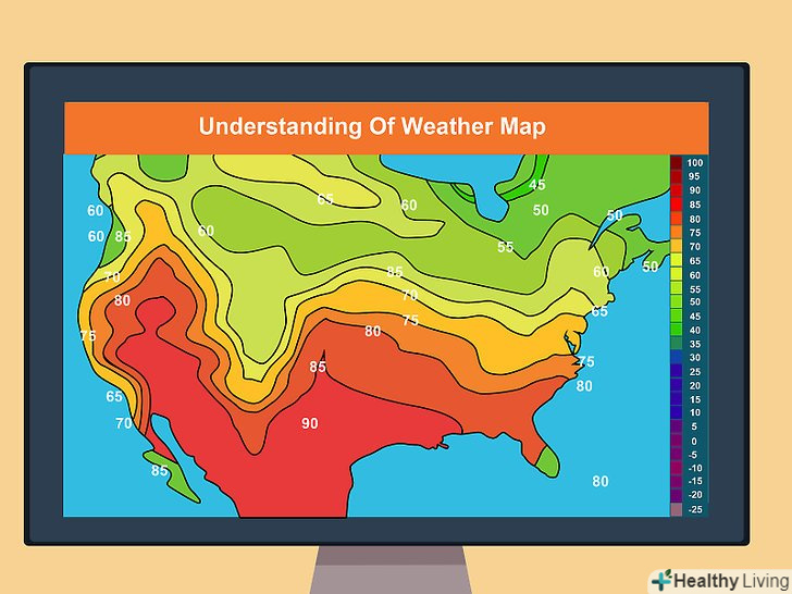 Вивчіть лінії на погодній карті.на погодній карті присутній багато інших ліній. Найважливіші з них вказують на ізотерми і ізотахи.[13]- ізотерми - лінії на погодній карті, в кожній точці яких зберігається однакова температура.