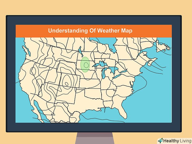 Вивчіть символи, що позначають атмосферний тиск. щоб визначити атмосферний тиск на приземній синоптичній карті, вивчіть ізобари (Ізо = рівний, бар = тиск) — прості вигнуті лінії, що вказують на зони однакового тиску. Ізобари відіграють важливу роль у визначенні швидкості та напрямку вітру.- Коли ізобари утворюють концентричні замкнуті (але не завжди правильні) кола, найменший коло в центрі вказує на центр тиску. Це може бути як область високого тиску (позначається буквою «В»), так і область низького тиску (позначається буквою «Н»).[5]