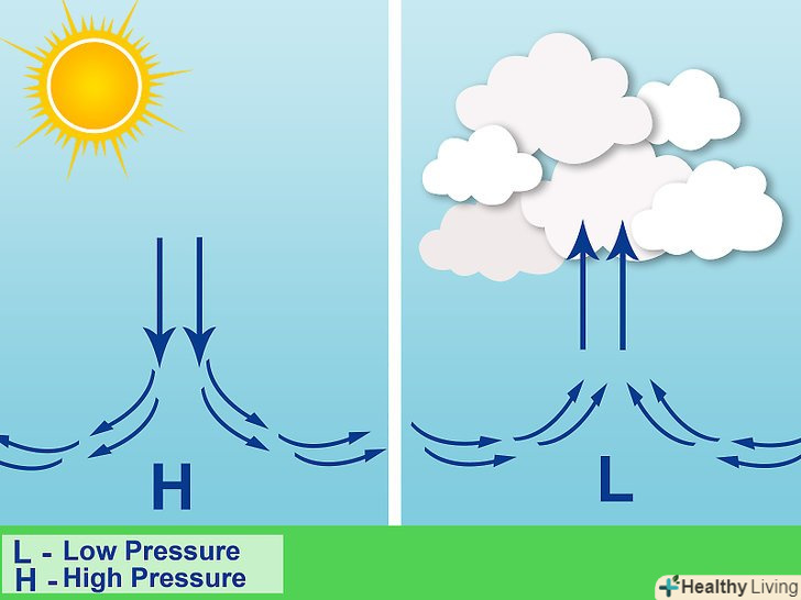 Зрозумійте, що таке область низького тиску.низький тиск зазвичай означає вологе повітря і в деяких випадках — опади. Область низького тиску — циклон) - це повітряна маса, що складається з менш щільного повітря, оскільки воно вологіше і/або тепліше, ніж повітря навколо цієї області. Навколишнє повітря стікається до центру циклону, а більш легке повітря піднімається вгору, часто викликаючи опади, так як при підйомі вологе повітря охолоджується.[2]- Цей ефект добре помітний, коли невидимий водяна пара, що міститься в повітрі, в результаті контакту з зовнішньою стороною холодного скла конденсується в краплі. Ось тільки краплі не почнуть формуватися, якщо скло буде недостатньо холодним. Таким чином, висхідний потік повітря призведе до утворення дощу тільки в тому випадку, якщо в області, куди він підніметься, повітря буде досить холодним для конденсації водяної пари в краплі, занадто важкі, щоб утримуватися висхідним повітряним потоком. Хмари-це теж краплі води, але вони через свою малу вагу залишаються зваженими в повітрі.