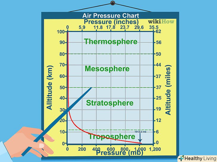 Розберіться, що означають показання атмосферного тиску.це величина ваги або тиску, який повітря надає на поверхню. Вона вимірюється в міліметрах ртутного стовпа або мілібарах. Навчитися читати значення атмосферного тиску вкрай важливо, оскільки області тиску пов'язані з певними погодними умовами.- Нормальним атмосферним тиском при нульовій висоті над рівнем моря вважається 1013 мбар (760 мм рт. ст.).[4]