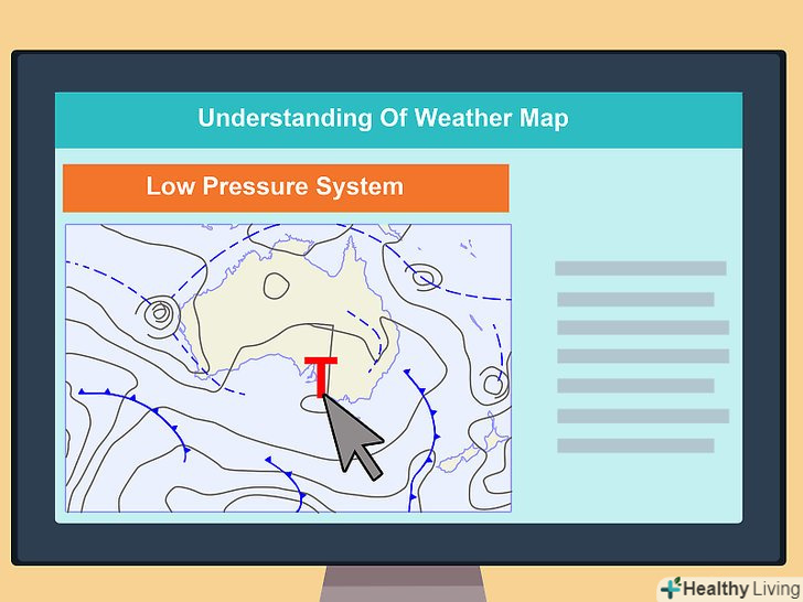 Навчіться визначати області низького тиску (циклони).вони характеризуються підвищеною хмарністю, сильним вітром, високою температурою і ймовірністю опадів. На синоптичній карті вони представлені у вигляді розташованих поруч ізобар, які спрямовані за годинниковою стрілкою (Південна півкуля) або проти годинникової стрілки (північна півкуля), зазвичай з буквою «Н» в середині ізобари, що утворює коло (буква залежить від мови, на якому представлена метеорологічна зведення).[6]- Радіолокаційні зображення можуть показувати області низького тиску. Тропічні циклони, характерні для південної частини Тихого океану, також називаються ураганами в Америці або тайфунами в прибережних районах Азії.