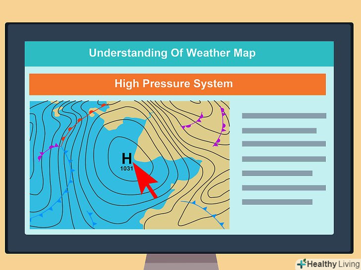 Зрозумійте що таке область високого тиску.Один з найважливіших аспектів вміння інтерпретувати синоптичні дані — це розуміння того, як на погоду впливають відмінності в атмосферному тиску. Високий тиск має на увазі суху погоду. Облать високого тиску — антициклон) - це повітряна маса, що складається з більш щільного повітря, оскільки він холодніше і/або суші, ніж повітря навколо цієї області. Важке повітря стікається вниз і в сторони від центру антициклону, немов вода, розлита на землю.[1]- В областях високого тиску погода, як правило, зберігається ясною або прояснюється.