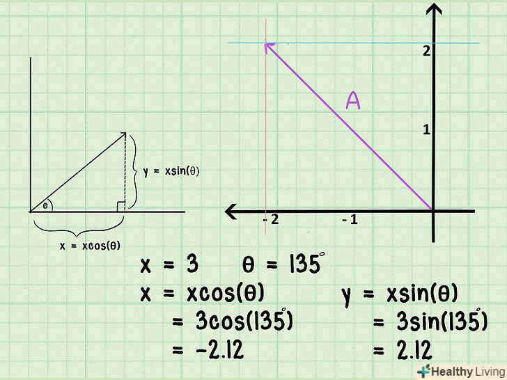 - Наприклад, дано вектор з модулем (значенням) 3 і напрямком 135o (по відношенню до горизонталі). Тоді компонент "х «дорівнює 3cos 135 = -2,12, а компонент» у" дорівнює 3sin135 = 2,12.