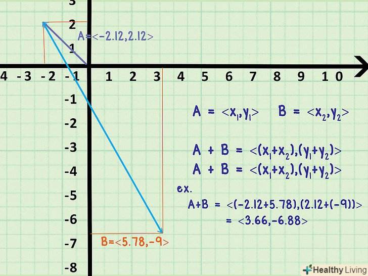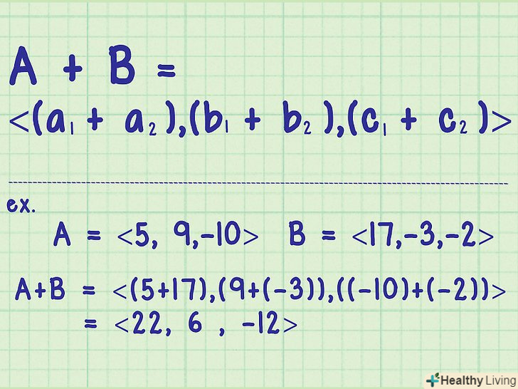 Для складання двох векторів складіть їх відповідні компоненти.іншими словами, складіть компонент " х "першого вектора з компонентом» х" другого вектора (і так далі). В результаті ви отримаєте компоненти х, у, z результуючого вектора.- A+B = lt;a1+a2,b1+b2,c1+c2gt;.