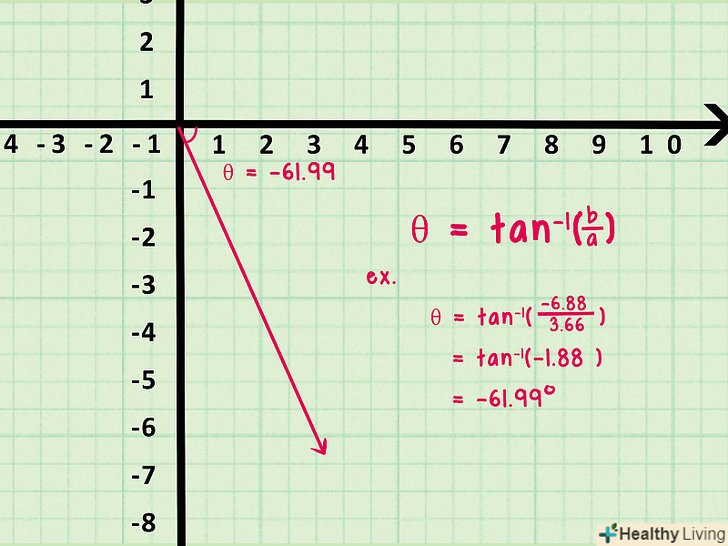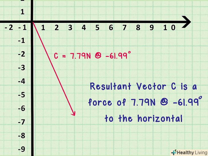 Уявіть результуючий вектор, позначивши його значення і напрямок.до значення вектора не забудьте приписати одиниці виміру, в яких дані складаються/віднімаються вектора.- Наприклад, якщо в нашому прикладі ви складали силу, вимірювану в Ньютонах, то відповідь запишіть так: 7,79 Н під кутом -61,99o (до горизонтальної осі).