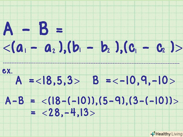 Для віднімання одного вектора з іншого необхідно відняти відповідні компоненти. як буде показано нижче, віднімання можна замінити складанням одного вектора і вектора, зворотного іншому. Якщо компоненти двох векторів відомі, відніміть відповідні компоненти одного вектора з компонентів іншого.- A-B = lt;a1-a2,b1-b2,c1-c2gt;