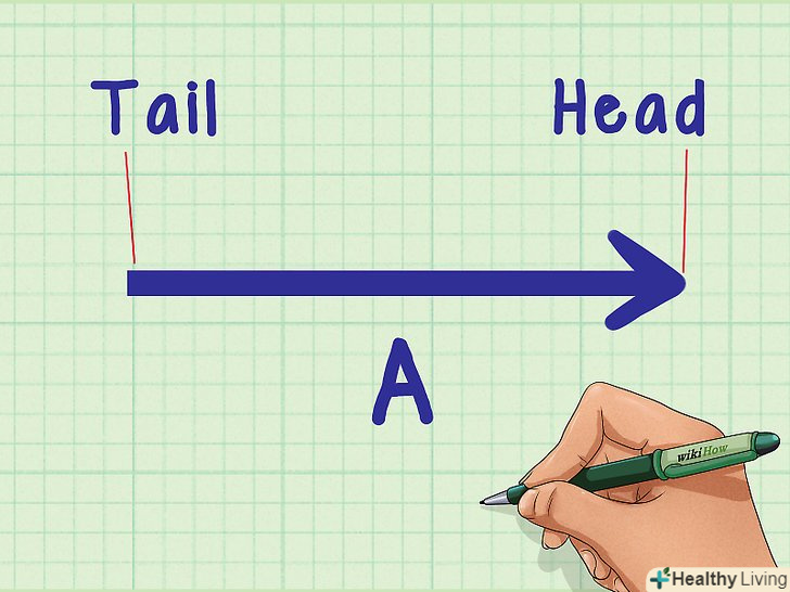 Так як вектори мають величину і напрямок, то у них є початок і кінець (початкова точка і кінцева точка, відстань між якими дорівнює значенню вектора).при графічному відображенні вектора він малюється у вигляді стрілки, у якій наконечник — кінець вектора, а протилежна точка — початок вектора.- При графічному відображенні векторів будуйте всі кути дуже точно; в іншому випадку ви отримаєте неправильну відповідь.