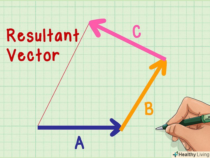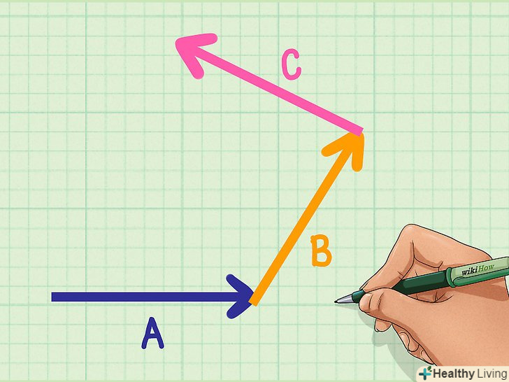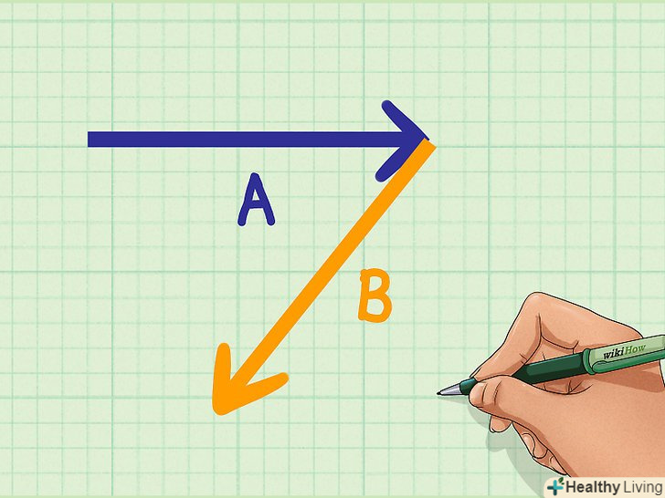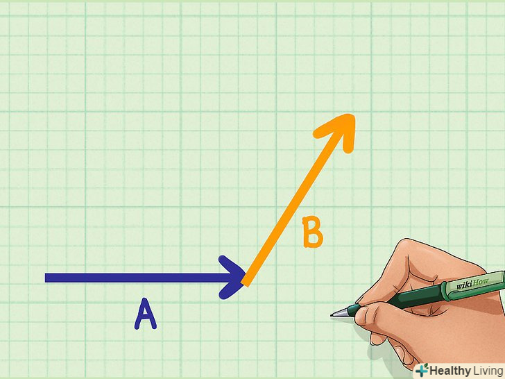 Для додавання векторів намалюйте їх так, щоб кінець кожного попереднього вектора з'єднувався з початком наступного вектора.якщо ви складаєте тільки два вектори, то це все, що вам потрібно зробити, перш ніж знайти результуючий вектор.- Зверніть увагу, що порядок з'єднання векторів не важливий, тобто вектор а + вектор B = Вектор B + вектор а.