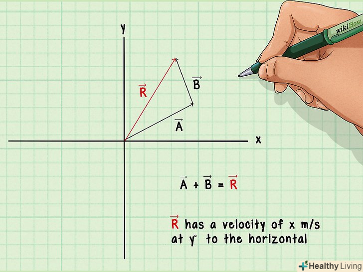 Уявіть результуючий вектор, позначивши його значення і напрямок. як зазначалося вище, якщо ви намалювали довжини складаються векторів і кути між ними дуже точно, то значення результуючого вектора дорівнює його довжині, а напрямок — це кут між ним і вертикальної або горизонтальної прямої. До значення вектора не забудьте приписати одиниці виміру, в яких дані складаються/віднімаються вектора.- Наприклад, якщо ви складаєте вектори швидкості, вимірювані в м/с, ТО і до значення результуючого вектора припишіть «м/с», а також вкажіть кут результуючого вектора в форматі «o до горизонтальної прямої».