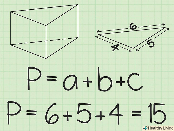 - Наприклад, сторони підстави рівні 6 см, 5 см і 4 см; щоб обчислити периметр, потрібно скласти три сторони: