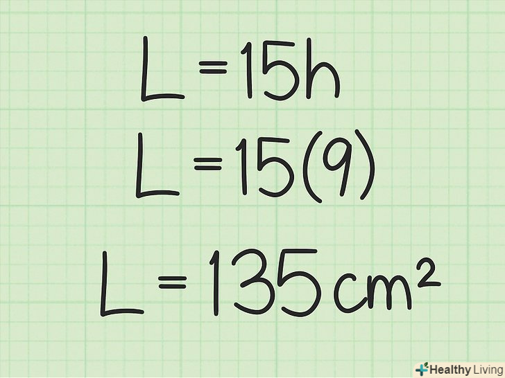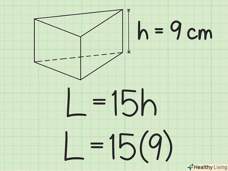 Підставте висоту призми в формулу для обчислення площі бічної поверхні призми.Висота призми дорівнює будь-якій стороні бічної грані, яка не належить основи. Як правило (але не завжди), такою стороною є більш довга сторона бічної грані.- Наприклад, якщо висота призми дорівнює 9 см, формула запишеться так: