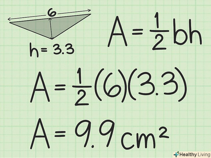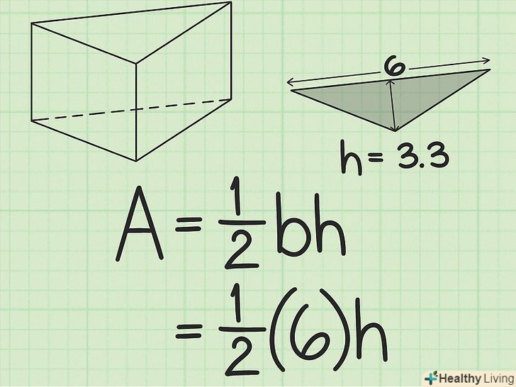 Підставте висоту трикутника в формулу для обчислення площі трикутника.помножте підставу на висоту, а результат розділіть на 2. Вийде площа підстави (в квадратних одиницях). Це друге значення, необхідне для обчислення площі поверхні призми.- Наприклад, якщо висота дорівнює 3,3 см, то розрахунки будуть виглядати наступним чином: