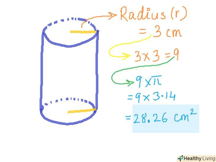 Знайдіть радіус однієї з основ.у підстав циліндра розміри і площа однакові, тому неважливо, який саме ви візьмете. У нашому прикладі радіус підстави дорівнює трьом сантиметрам. Запишіть його.. Якщо вам дано тільки діаметр, розділіть його на два. Якщо вам дана тільки окружність, розділіть її на 2π.