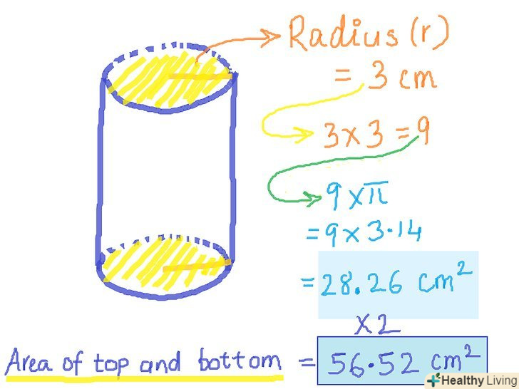 Подвійте результат, щоб отримати площу верхнього і нижнього кола. просто помножте попередній результат, 28,26 см2, на два, щоб отримати площу двох підстав. 28,26 x 2 = 56,52 см2. Це площа двох підстав.