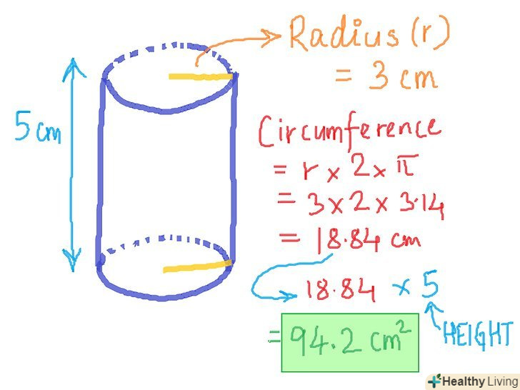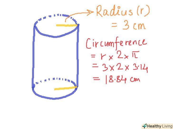 Знайдіть коло одного з кіл.окружність потрібна вам, щоб знайти площу бічної поверхні, тобто площа сторін циліндра. Щоб знайти окружність, просто помножте радіус на 2π. 3 см x 2π = 18,84 см.