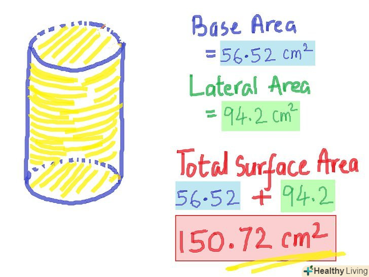 Складіть площу бічної поверхні з площею підстав.склавши площу бічної поверхні з площею двох підстав, Ви отримаєте площу поверхні циліндра. Вам залишилося скласти 56,52 см2, площа двох підстав, з площею бічної поверхні, 94,2 см2. 56,52 см2 + 94,2 см2 = 150,72 см2. Площа поверхні циліндра висотою п'ять сантиметрів з радіусом три сантиметри дорівнює 150,72 см2.