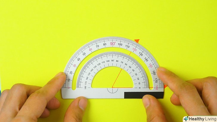 Поверніть транспортир так, щоб одна зі сторін кута збіглася з підставою інструменту.не поспішаючи повертайте транспортир і стежте за тим, щоб вершина кута залишалася в центрі. В результаті одна зі сторін кута повинна поєднатися з підставою транспортира.[3]- При цьому друга сторона кута повинна перетинати дугу транспортира (його округлу частину).