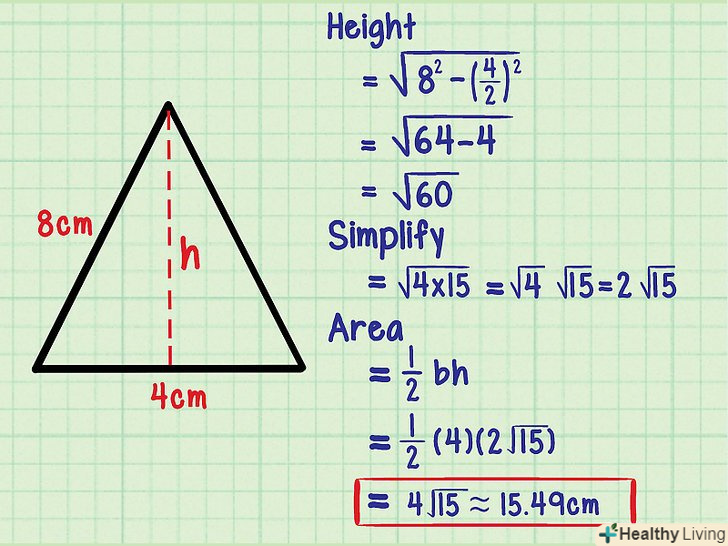 Розглянемо більш складний приклад.у більшості випадків вам буде дана більш важке завдання, ніж розглянута в нашому прикладі. Щоб обчислити висоту, потрібно витягти квадратний корінь, який, як правило, не витягується. У цьому випадку запишіть значення висоти у вигляді спрощеного квадратного кореня. Ось новий приклад:- Обчисліть площу рівнобедреного трикутника, сторони якого рівні 8 см, 8 см, 4 см.