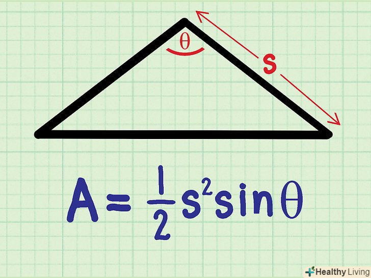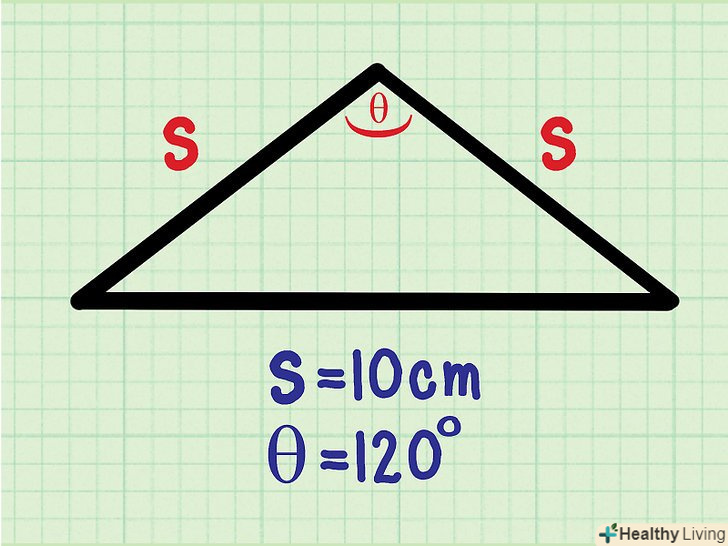 Обчисліть площу по бічній стороні і прилеглому кутку. якщо Ви знайомі з тригонометричними функціями, площа рівнобедреного трикутника можна обчислити по бічній стороні і прилеглому кутку. Наприклад: [3]- Бічна сторона рівнобедреного трикутника дорівнює 10 см.